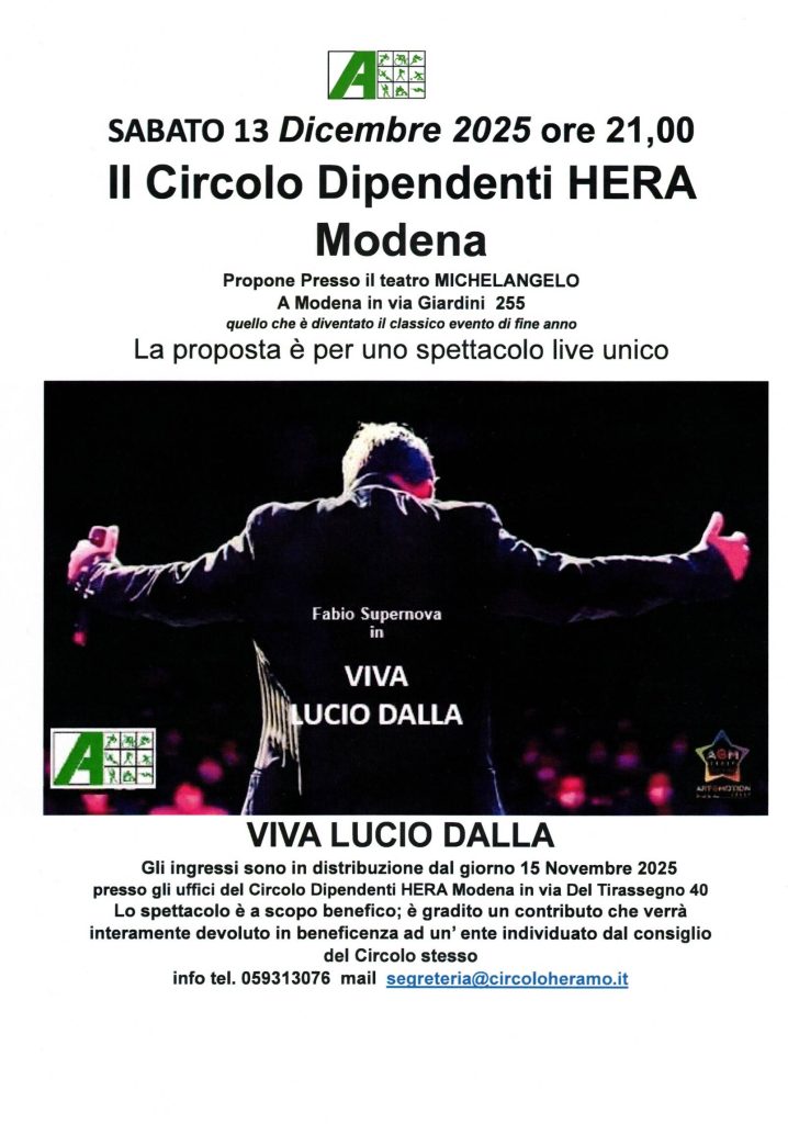 Sabato 13 dicembre 2025, alle ore 21, il Circolo Dipendenti HERA di Modena propone al Teatro Michelangelo (via Giardini 255) il tradizionale appuntamento di fine anno, diventato ormai un classico per soci e cittadini.